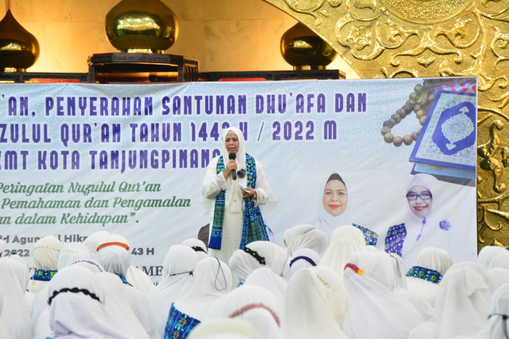 Putrakepri.com, Tanjungpinang – Ketua Badan Kontak Majelis Taklim (BKMT) Provinsi Kepri Hj. Dewi Kumalasari Ansar memberikan santunan untuk kaum dhuafa masyarakat Kota Tanjungpinang di masjid Agung Al Hikmah, Tanjungpinang, Selasa (19/4). Penyerahan santunan untuk kaum dhuafa ini disejalankan dengan kegiatan peringatan Nuzulul Quran yang digelar BKMT Tanjungpinang.