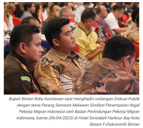 Putrakepri.com, Batam-Bupati Bintan Roby Kurniawan menghadiri undangan Diskusi Publik dengan tema Perang Semesta Melawan Sindikat Penempatan Ilegal Pekerja Migran Indonesia oleh Badan Perlindungan Pekerja Migran Indonesia, Kamis (06/04/2023) di Hotel Swissbell Harbour Bay Kota Batam. Menteri Koordinator Politik, Hukum dan Keamanan Mahfud MD langsung memberikan paparan terkait hal penting tersebut.